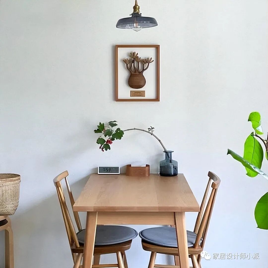 靠墙摆放了一张双人位的餐桌,偶尔会邀请朋友小聚。依旧是原木色系,餐桌和餐椅的设计简约大方,同时又透露着古朴的气息。