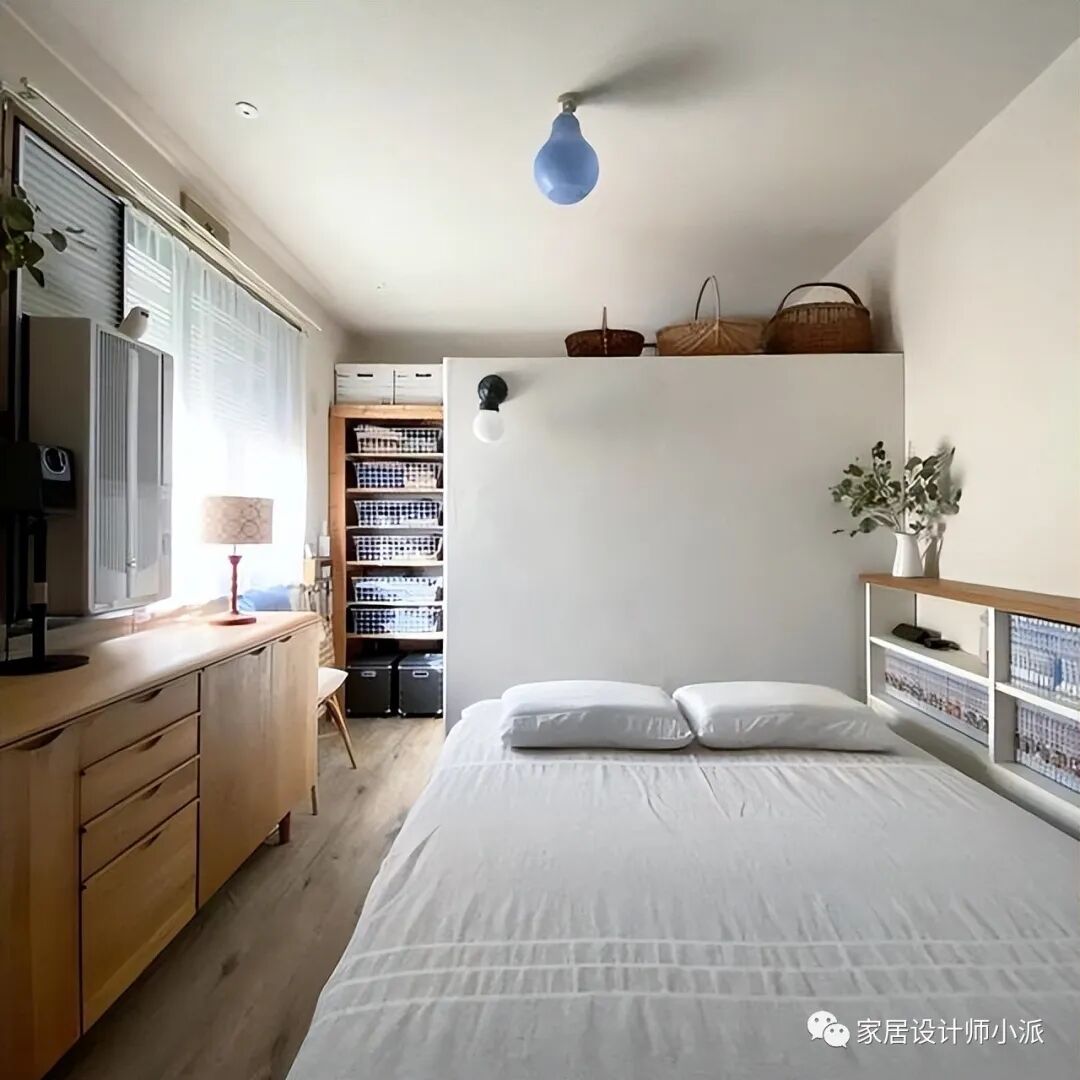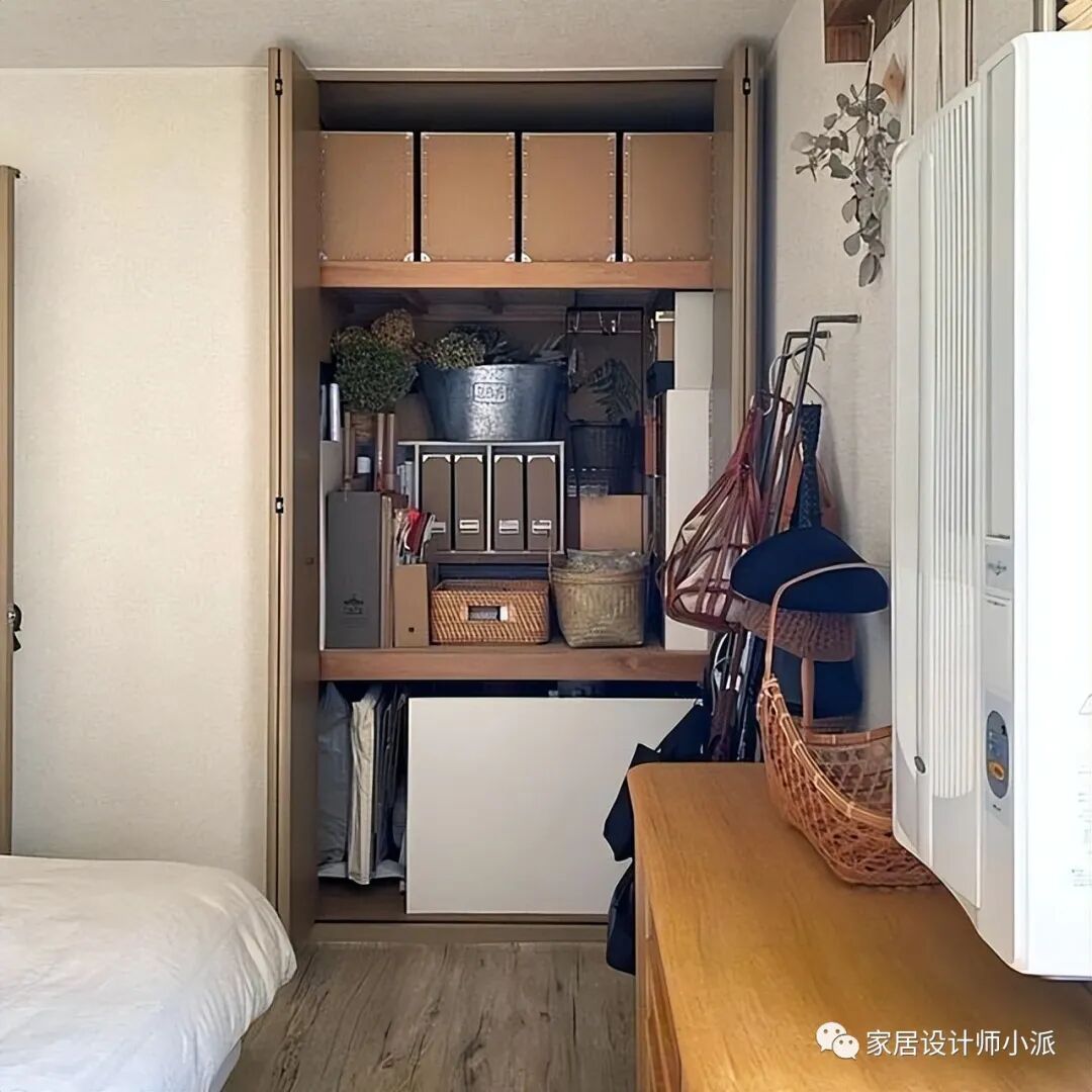 原木色和白色的搭配,看起来简单又清爽。没有过多繁杂的设计,就连用来收纳的衣柜,也是如此的简单有特色。