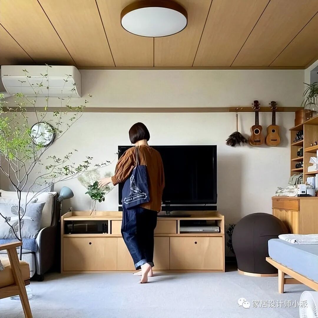 阿姨精心布置的客厅,依旧延续简约的日式风,简单又温馨。没有过多的装饰物,整屋地面铺了浅灰色的地毯,和原木色的吊顶,以及白色的墙壁形成鲜明的对比。