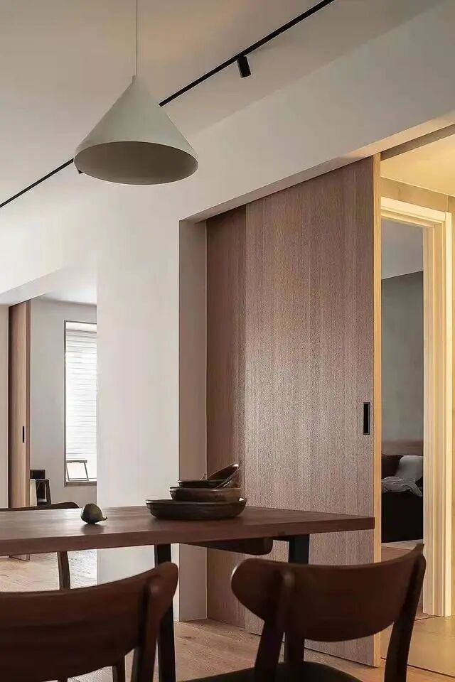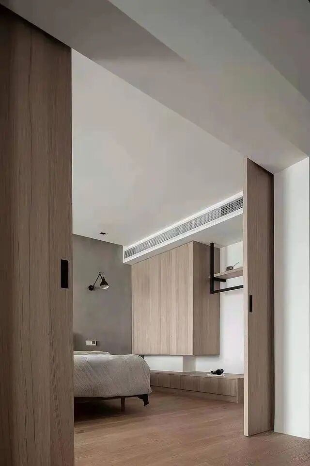 卧室的原木滑门是整个空间的最大看点,和传统的门框设计不同,这是一个木质推拉隐形门。