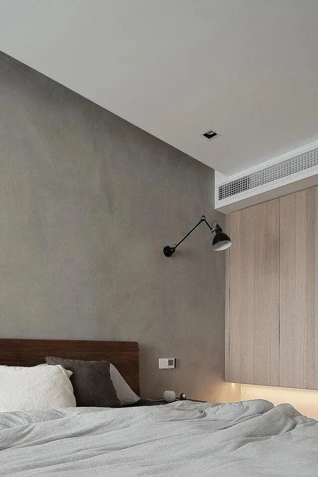 主卧还是继续延续着黑白灰的感觉,可以看到后面的深色原木,硬包的高度是稍微高于开关的高度,在整个视觉空间上,有高有低有起有伏的动态。