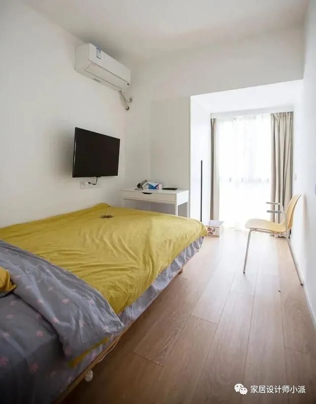 次卧的设计随意简单,靠墙摆放着一张单人床,足够用来招待亲朋好友。因为房屋的格局不是很好,所以电视也悬挂在靠墙的位置,无法满足躺在床上看电视的心愿。