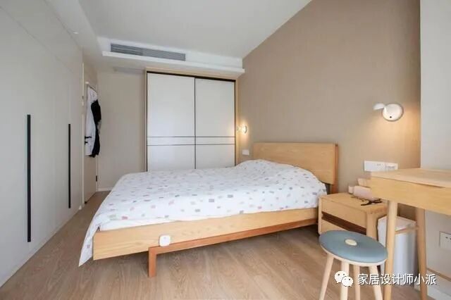 到顶的衣柜,用来收纳换季的衣服。原木色柜体,搭配白色简约推拉式柜门,不会显得繁琐。