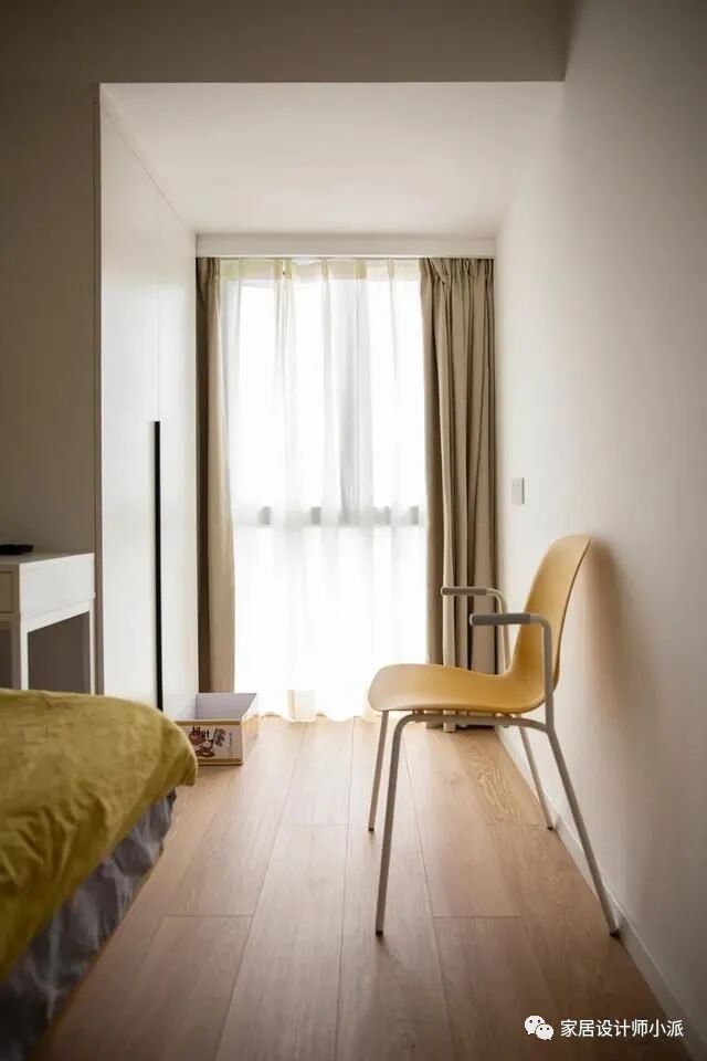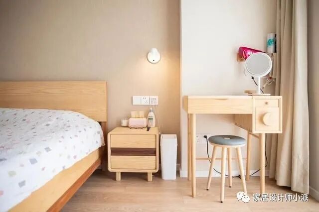 卧室连着小阳台,划分出一个梳妆区,简单的原木色化妆台和凳子,却感觉比很多大牌梳妆台都有质感。