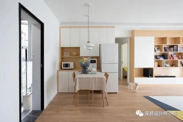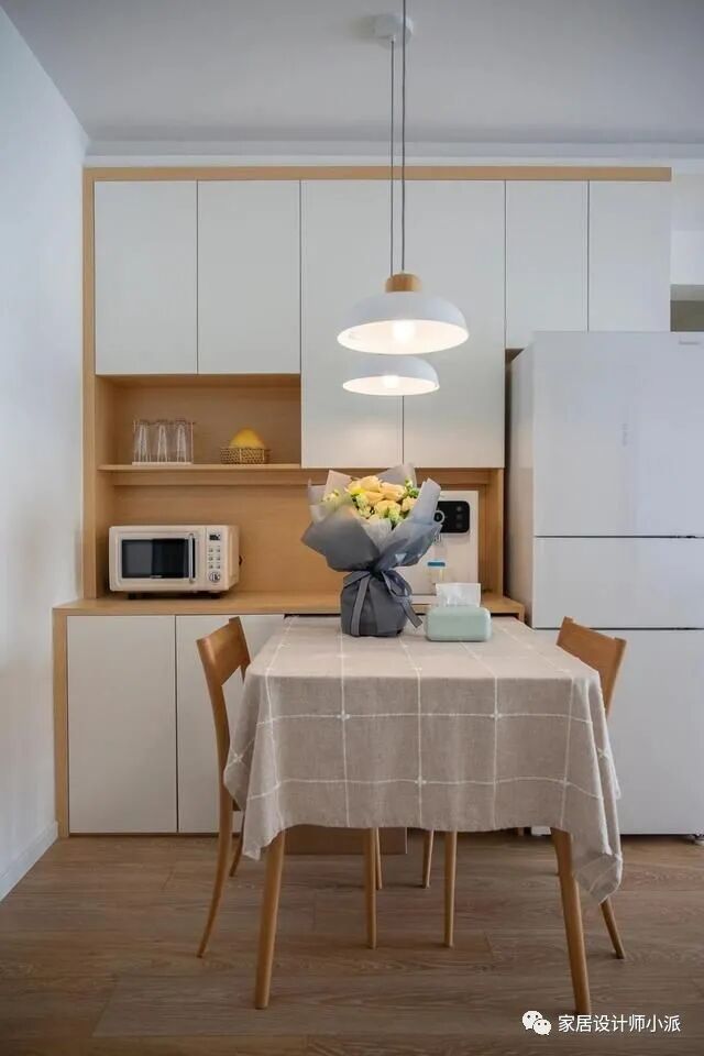 白色的无把手柜门设计,搭配原木色的柜体,简单自然。小户型房子,最缺的就是“面积”,所以收纳要到位,才不会显得杂乱无章。