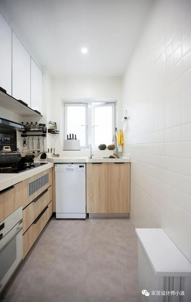 厨房是L型的经典设计,能够上墙摆放和收纳的物品,坚决不会摆放在台面上,紧凑户型的朋友,记住了吗?