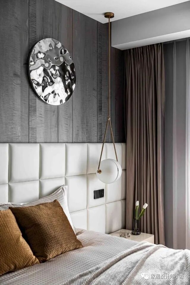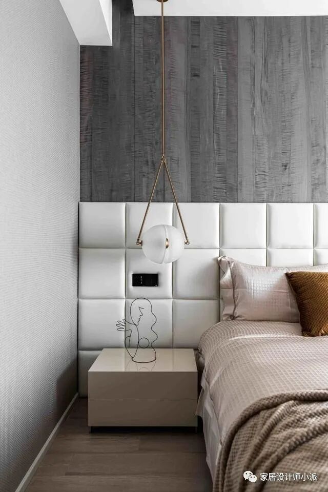 米色格子的软包床头,搭配深色系的板材,塑造了质感十足的床头背景墙。
