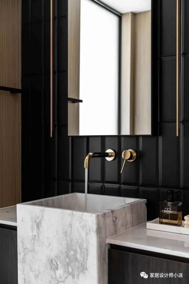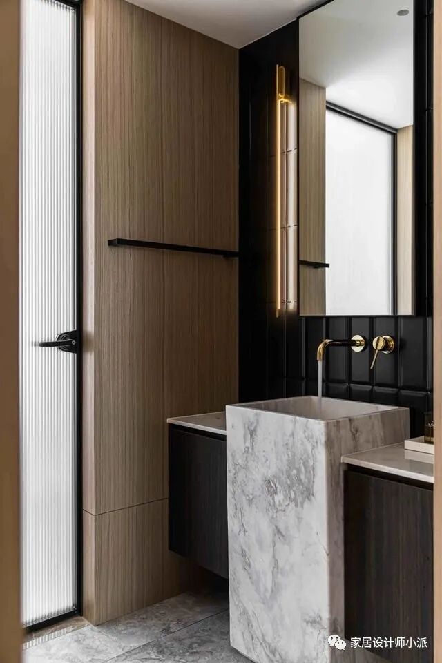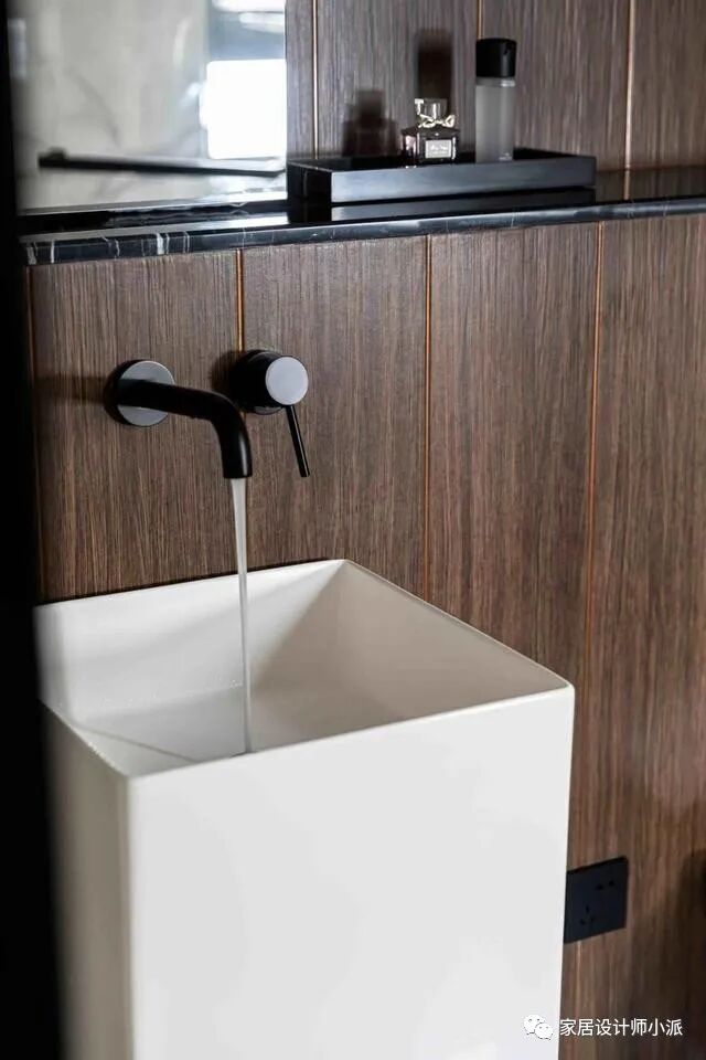 湿区的墙壁,没有做墙砖,而是采用黑色的防腐木。这样的卫生间,瞬间注入了高端的灵魂,堪称精品。