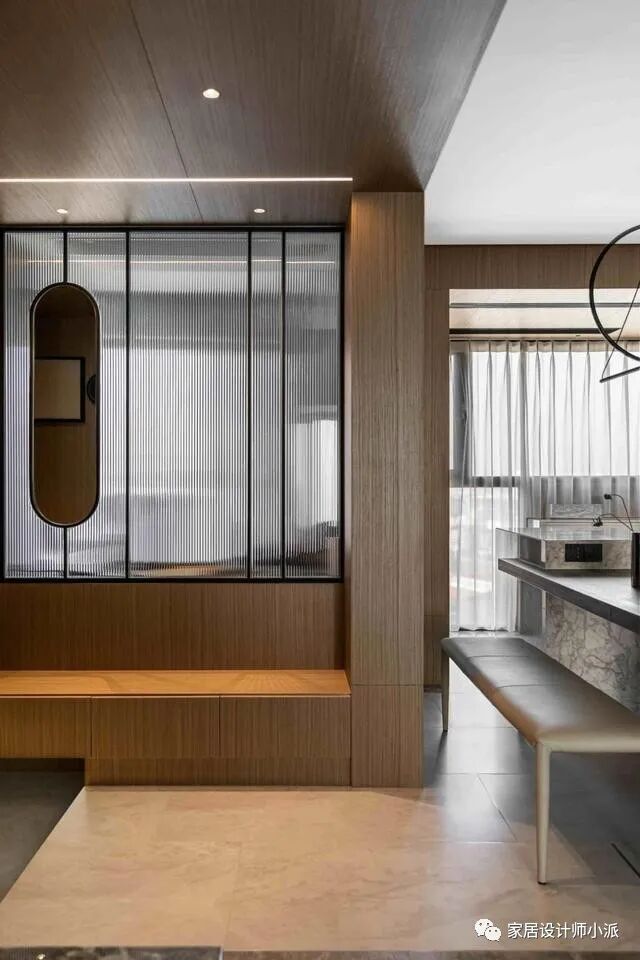 尤其是换鞋区顶部的长虹玻璃隔断,可谓是一举多得的设计。从门厅来看,它最大的效果就是装饰性很强;但若是从另一面看过去,又有不同的作用。