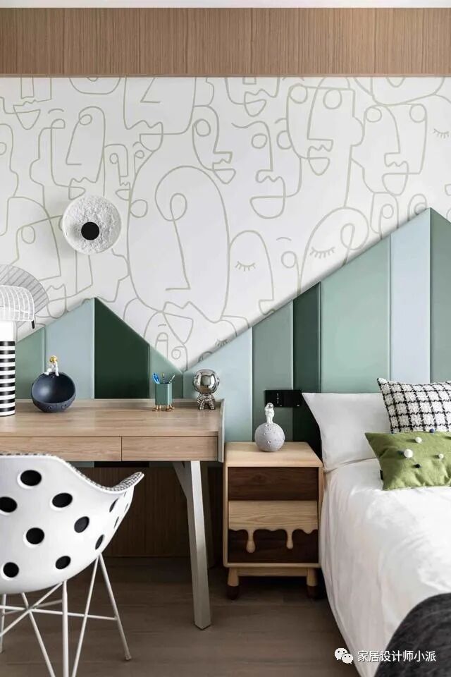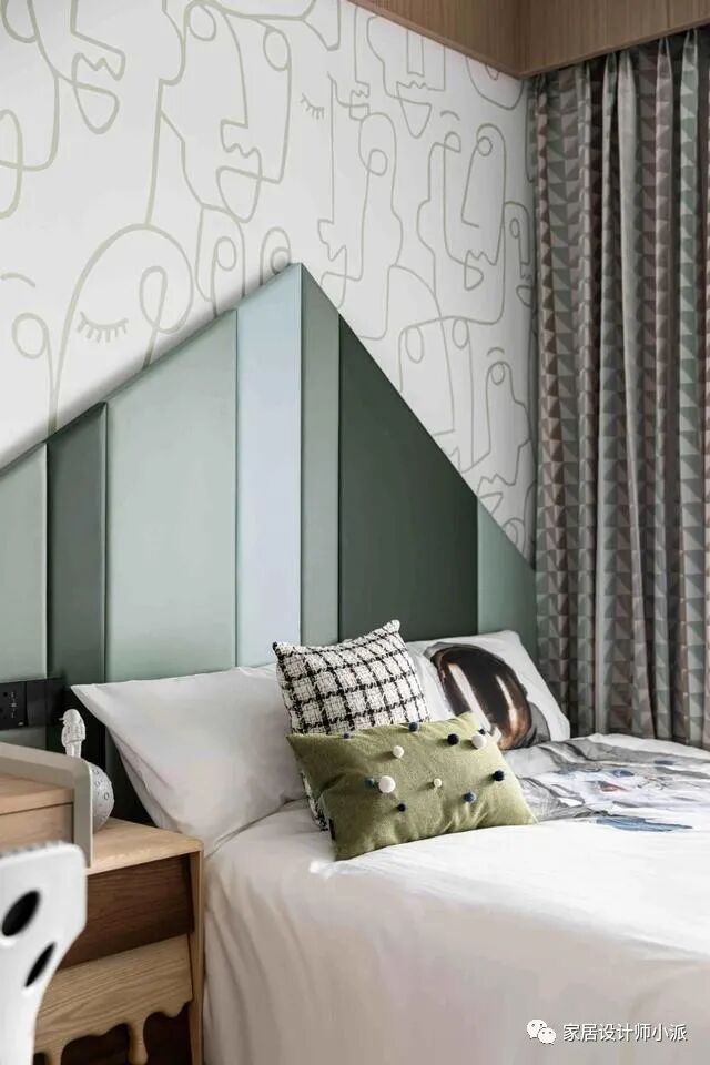 拼接的三角形床头,搭配卡通造型的墙壁,营造出了别致的童趣,既简约又时尚。