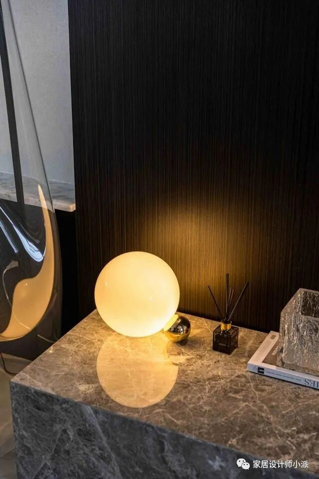 大理石边角柜上,也放了一盏暖黄色的灯具。它的造型很简单,如同传统的白色灯泡一般,但氛围感十足。