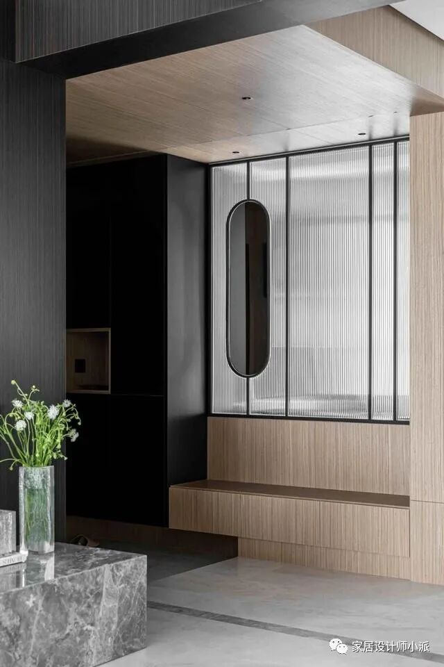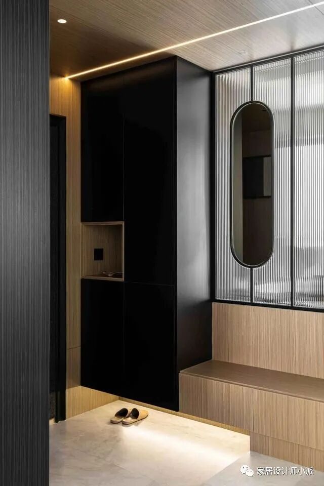 走入门厅,第一眼就是低调的奢华感。不同颜色的原木板材,搭配黑色边框的长虹玻璃隔断,打造出不一样的入门鞋柜。