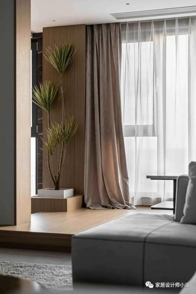 客厅的设计还有一个巧妙之处,电视柜延伸到阳台的位置。单从视觉效果来看,阳台区域做成了抬高设计,区域划分特别明显。