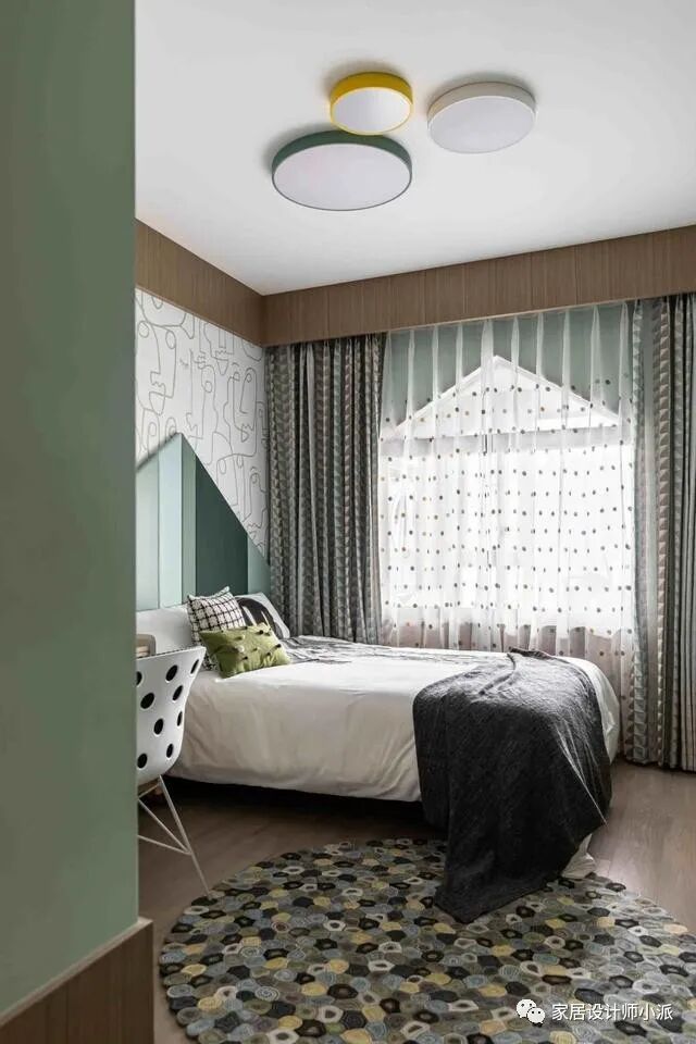 儿童房的装修,颜色不宜过重,不然会显得特别压抑。全屋以清新的绿色为主,从墙壁到床头,再到软装窗帘,都是大自然的味道。