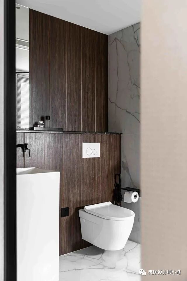 卫生间的湿区,也是满满的高级感。白色的壁挂式马桶,隐藏的水箱,以及黑色的纸卷架,每一处都是精心挑选。