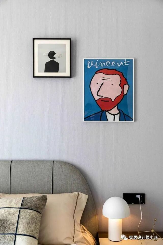 黑白灰的颜色有些单调,所以床头墙壁上,悬挂了一副蓝色的抽象派人物画,瞬间就能吸引人的眼球。