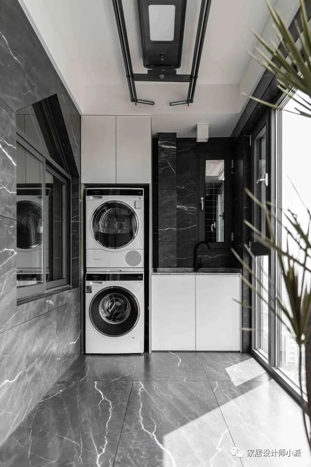 而另一侧,又呈现另一种景象,灰色的地砖和墙砖上墙,瞬间变得很奢华。这片区域,就是业主家的洗衣区,阳光甚好。
