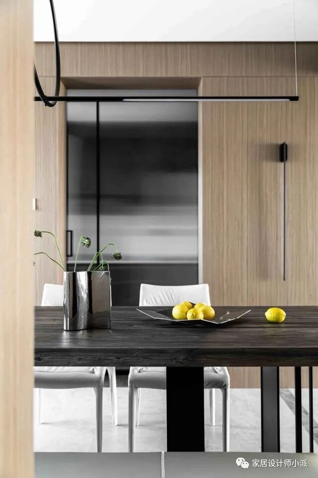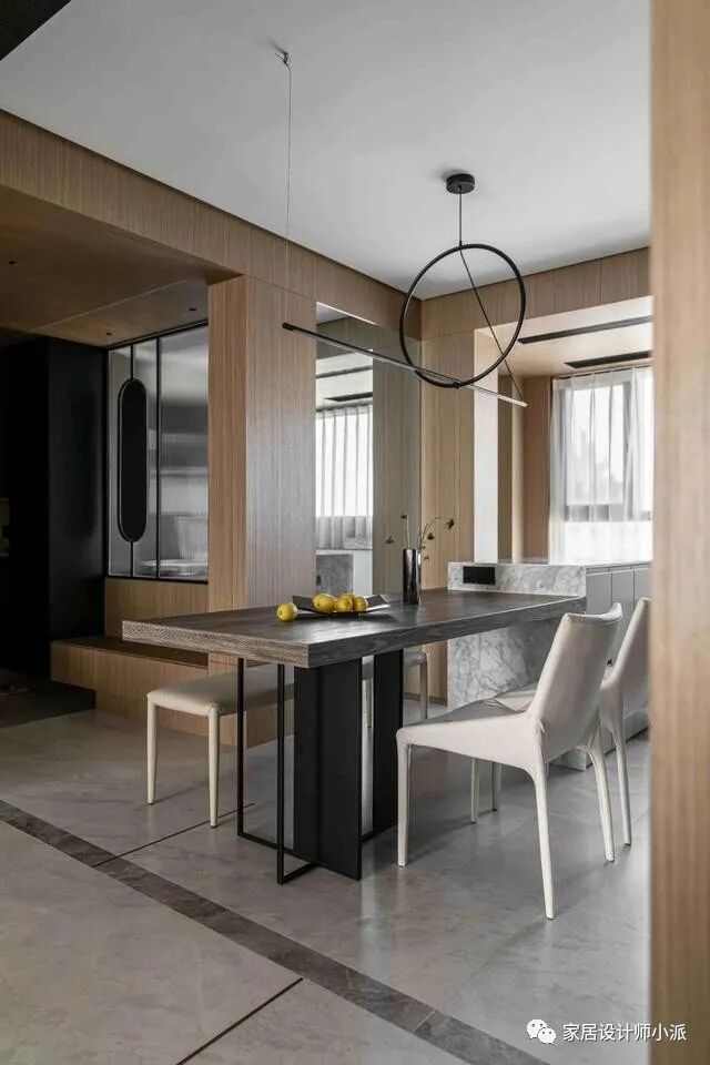 整个餐厅区,选择以原木色的板材为主。单从视觉效果来说,要比传统的墙漆或墙布设计更有高级感,而且更好打理。