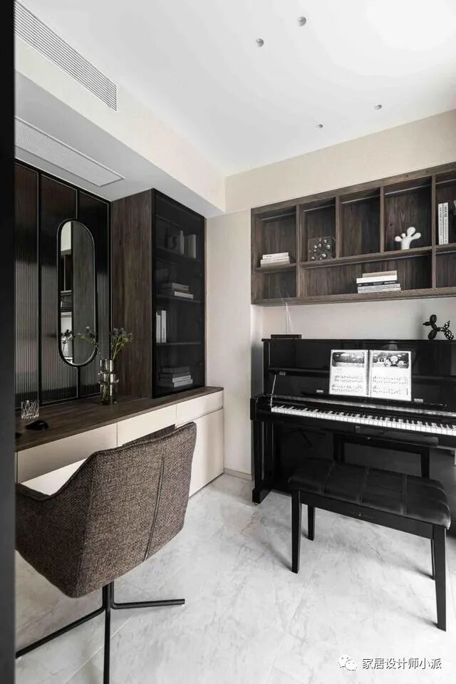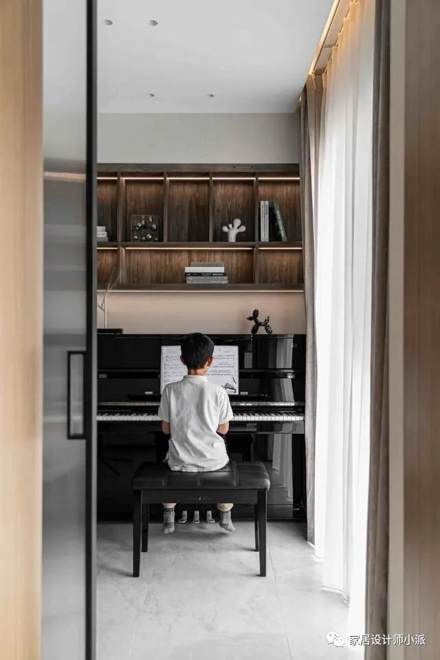 这片区域,准确来说是业主精心设计的书房。摆放了孩子喜欢的钢琴,同时还做了悬挂书架。