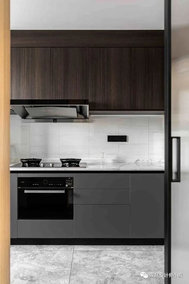 小书房对面,则是业主家的厨房位置。灰色带花纹的设计,深色系的吊柜和橱柜设计,使得厨房显得更干净。