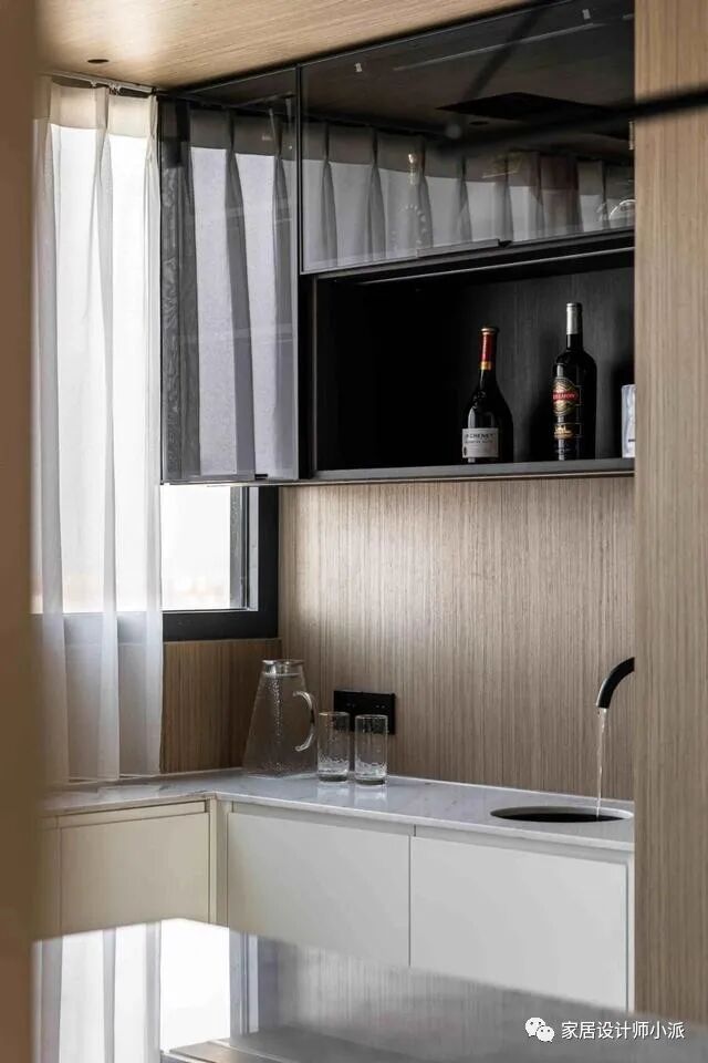 阳台位置,特意做了黑色质感的吊柜,用来收纳喜欢的酒品,显得愈发高大上。黑色,总是散发出神秘的气息,重点是很百搭。