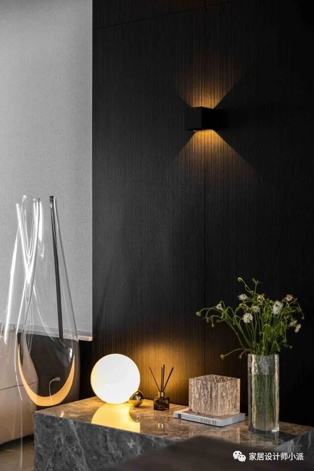 深色系的墙壁上,悬挂了一盏暖黄色的壁灯,瞬间变得温暖起来。若是不打开壁灯,真的很难发现它的存在。