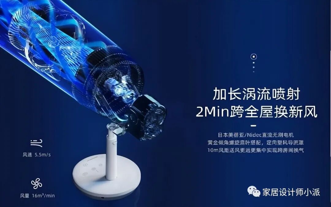 首先是搭载直流无刷电机,转动更平滑、转速更快,黄金倾角螺旋扇叶,搭配定向塑风导流罩,能做到以5.5m/s风速、20米超长送风距离快速推动全屋空气流动,让吹风不受空间和距离阻碍。