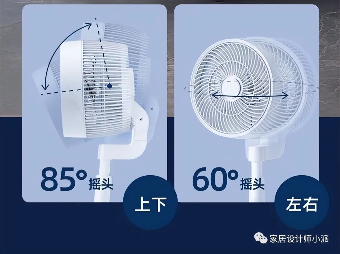空气循环扇的摇头角度也就是它的送风角度,送风角度越大,风能够触达的范围就越大,效果也就越好。