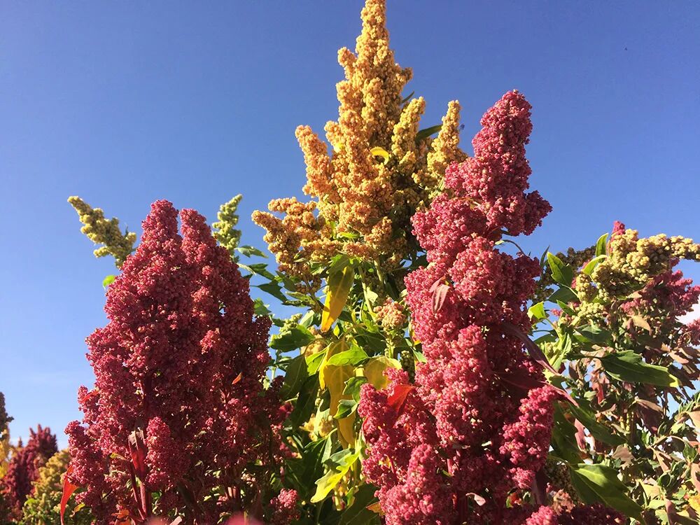 藜麦成熟之后,整株植物五彩斑斓,非常漂亮。它的果实穗子像高粱米一样长得长长的,但籽粒很小。藜麦有白色的,还有黑色和红色的,通常这三种颜色混在一起被称为三色藜麦。也有单独分开的白色藜麦,据说味道更好一些。