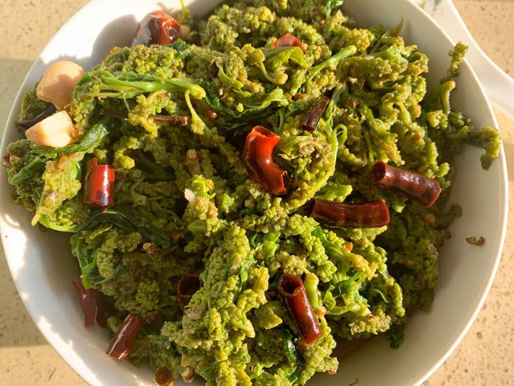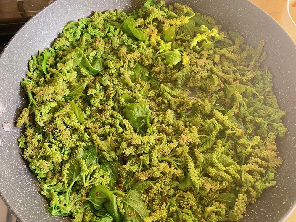 在摘花穗时,可以连它的边上的嫩叶、嫩尖一起摘,都是可以吃的。摘回去之后,把叶梗去掉,清洗干净叶子和花穗之后,下沸水焯一下,可以去掉涩味,然后再来炒鸡蛋就可以了。也可以用腊肉、豆豉来炒,也是香得很。