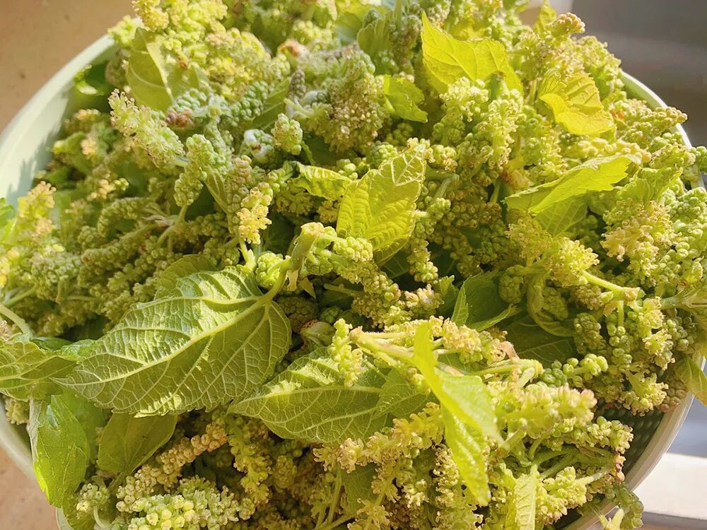 桑果花的花和其他植物的花长得不一样,它有点像构树穗,是一串串绿色的花穗。最好是在桑果花的花穗没有绽开之前采摘,这样它会比较嫩一些,也有嚼劲。如果已经开花了,那就有点老了,吃起来没有鲜味了。