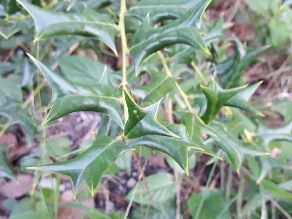 和很多有刺的树木不一样,猫儿刺的树干上、树枝上是没有刺的,它的刺全在叶子上。猫儿刺的叶子有点像猫耳朵,有4、5个角,每个角上都有一根长长的尖刺,这些刺看着很不起眼,但若是不小心碰到的话,保准儿扎的你“哇哇”叫。