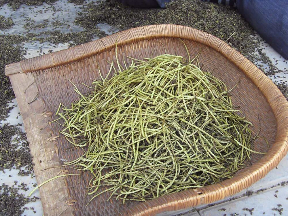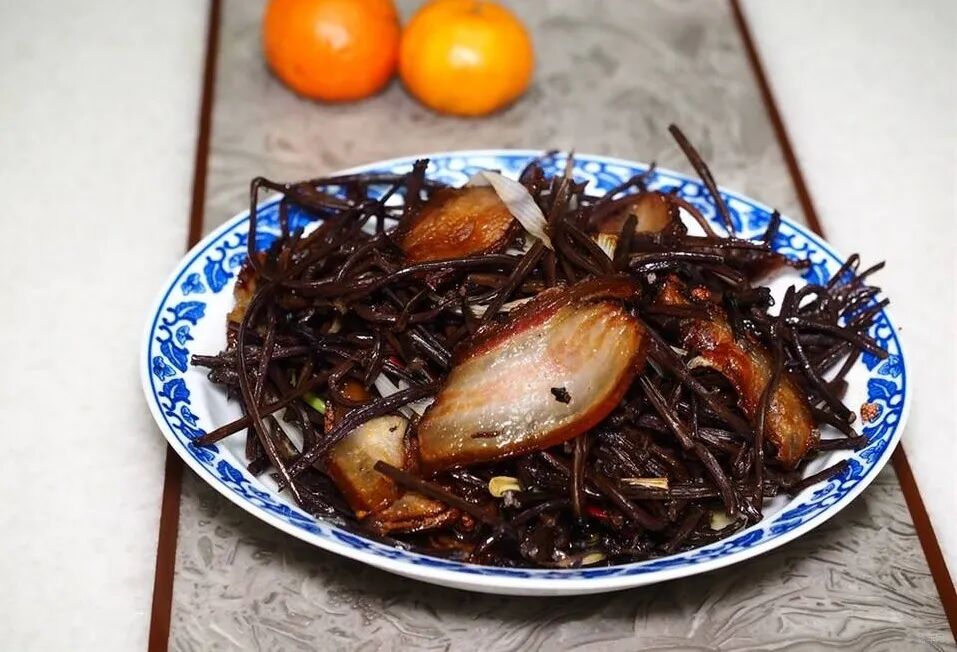 此外,还可以将核桃花处理好后晒干保存,焯水过后像晒干菜一样,把花梗晒得干干的,此时花梗颜色变成黑色了,看着有点奇怪,但丝毫不影响它的香味。经过阳光晒过之后,核桃花梗有浓浓的干菜香味,不管是炖、炒、做馅都相当美味。这种晒干的核桃花还有一个名字叫“长寿菜”,在市场上也有卖,还挺贵的呢!