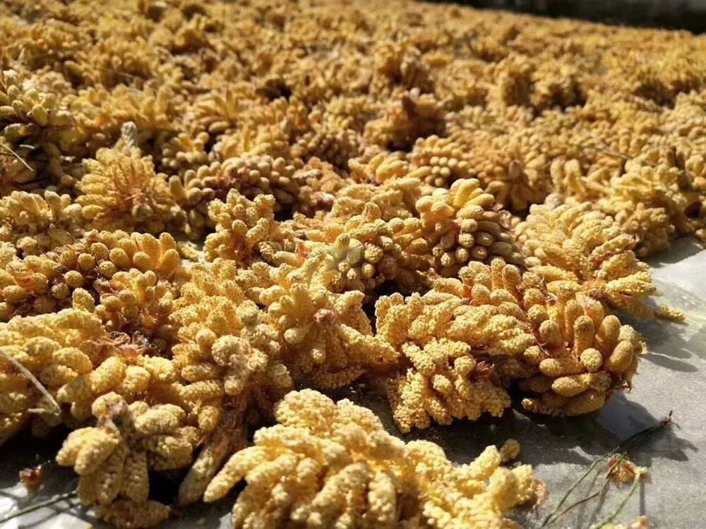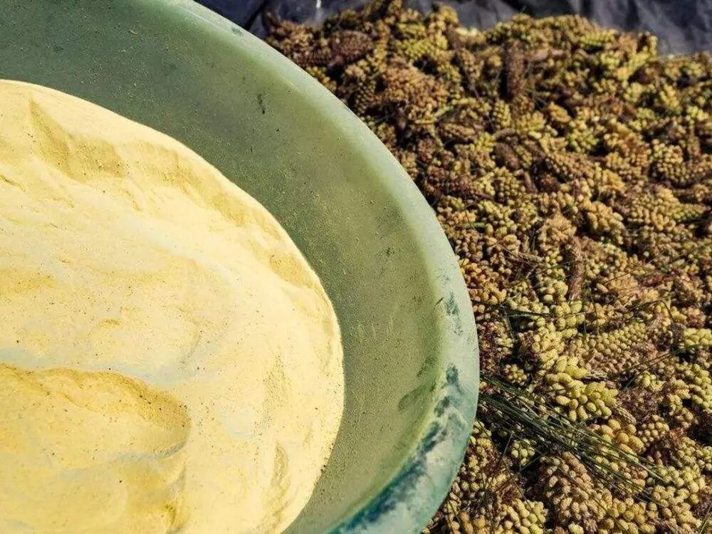 另外,有朋友可能会有疑问,采摘松树花,不会对松树造成破坏吗?让松树无法结果实吗?其实这点大家不用担心。松树花是春天时松树雄枝抽新芽时的花骨朵,而要采摘的并不是整棵松树花,而是采集松树花上的花粉,这东西也叫“松花粉”,在采集的时候,其实也相当于帮松树传粉了。