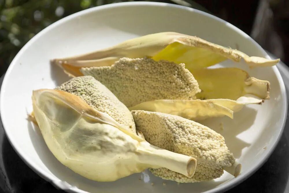 其实棕榈花真的能吃,而且也很好吃。在我国江西、广东、云南的部分农村地区,棕榈花就是一种人们常吃的野菜,并且还给它起了一个十分好听的名字,叫做“棕包米”。特别是像云南腾冲一带的老百姓,更是喜欢吃棕榈花,在每年4月份棕榈树刚开花时,就会去采摘正要含苞待放的嫩棕榈花,采摘回来之后,经过简单的处理就可以做菜了。