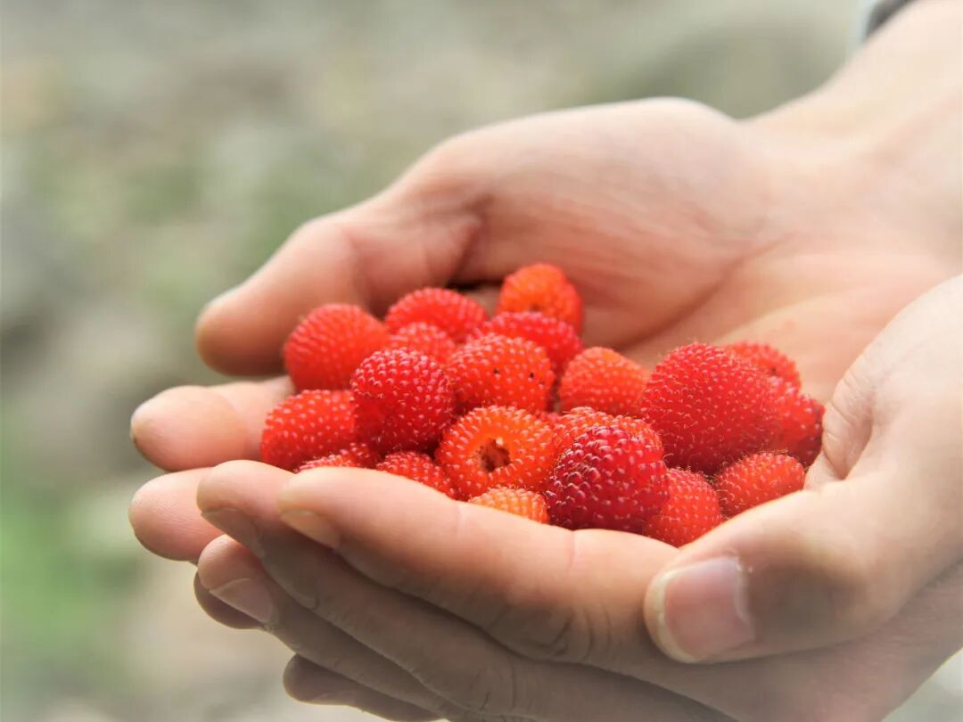不仅好吃,蓬蘽果实还会散发出一股特殊的香味,果实内的汁水也丰富,一口吃个3、4颗下去,满嘴爆汁儿。