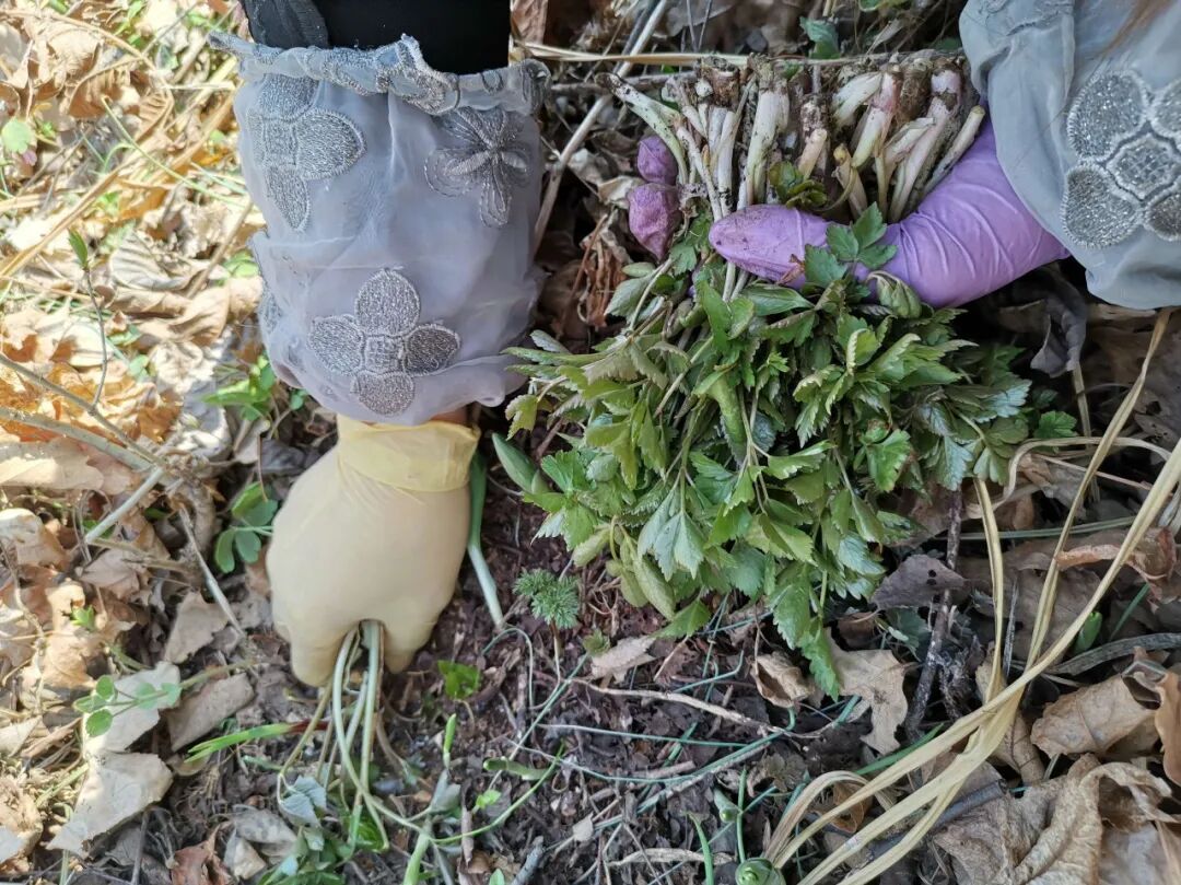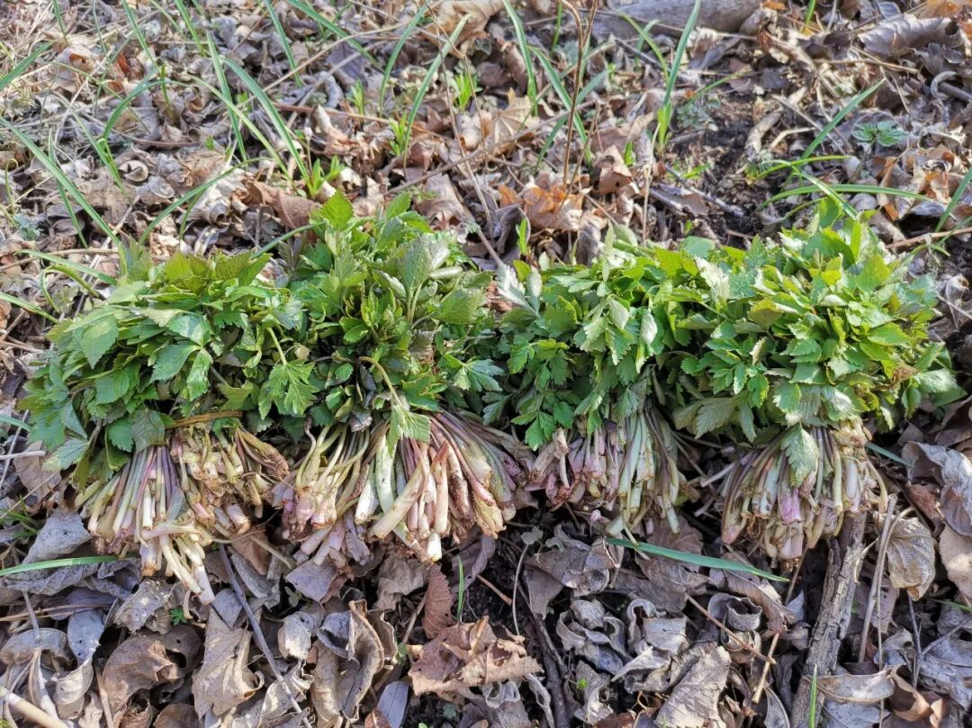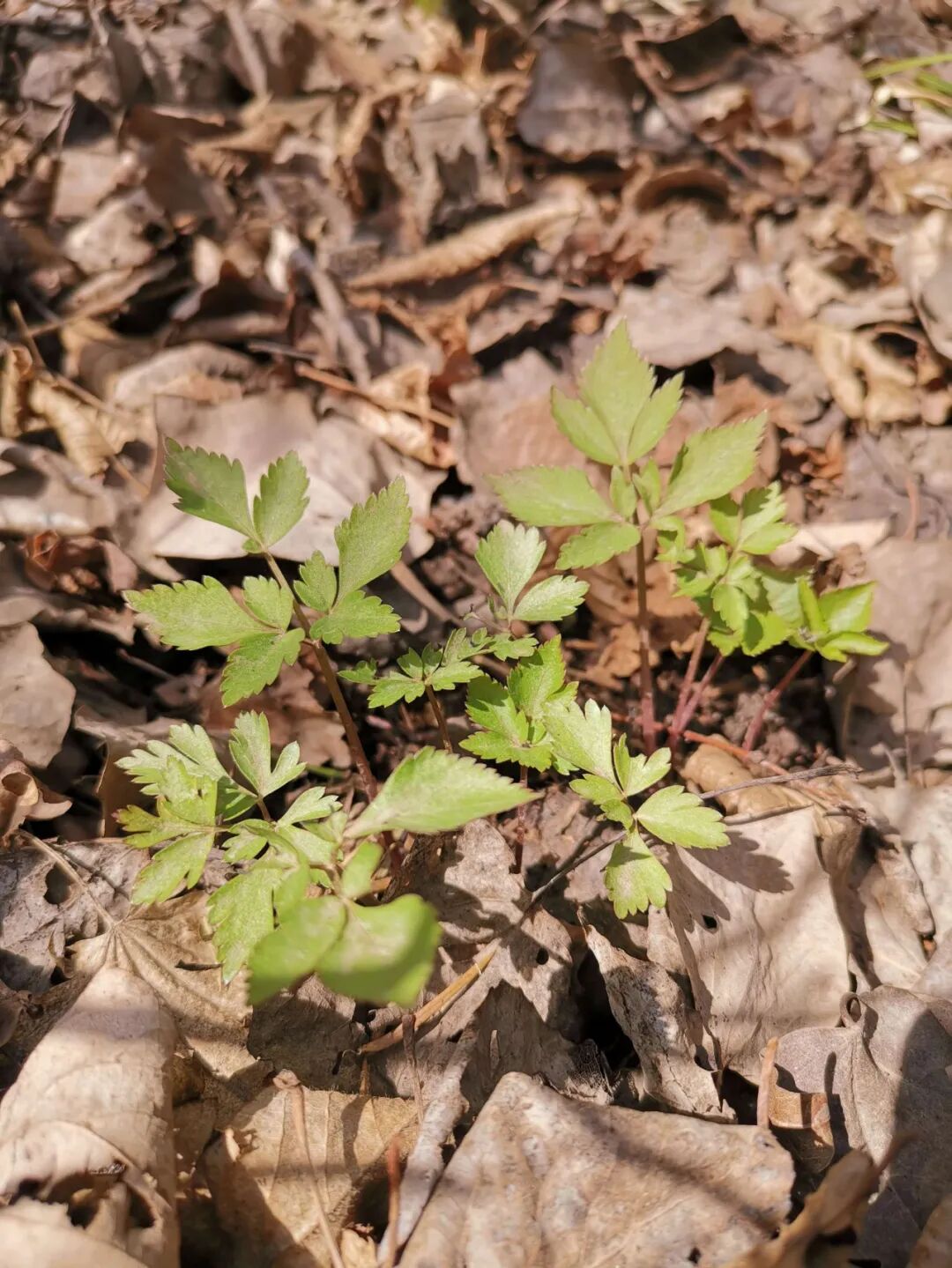 大叶芹也悄咪咪地长出来了。阳坡的长得早,因为有太阳照射,更暖和一些,背阴坡的长得晚,早期最好是去阳坡找,找到的成功率更高一些。