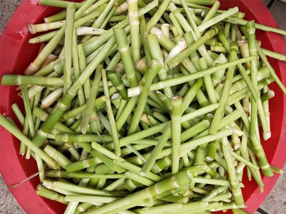 荻笋是素菜,略带苦味,最适合和腊肉、五花肉、熏肉等肉类一起炒,加点干红辣椒,可以完美地把它的香味激发出来,能让人多吃几碗饭。在外的游子,最思念的就是家乡的这一碗荻笋,但在外面却是很难买到。