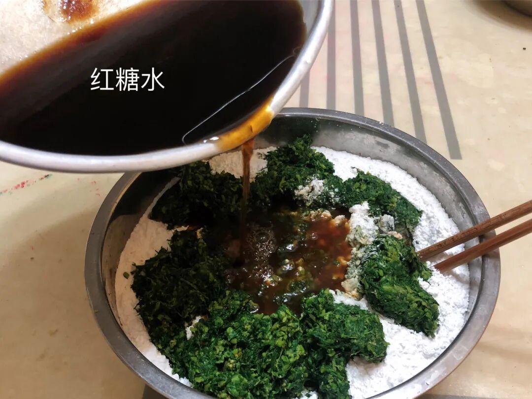 第五:将红糖水慢慢倒入米粉与鼠麴草粒中,充分揉匀后放置十几分钟,然后分成大小均匀的剂子,再把剂子搓成小圆球米粉团待用。