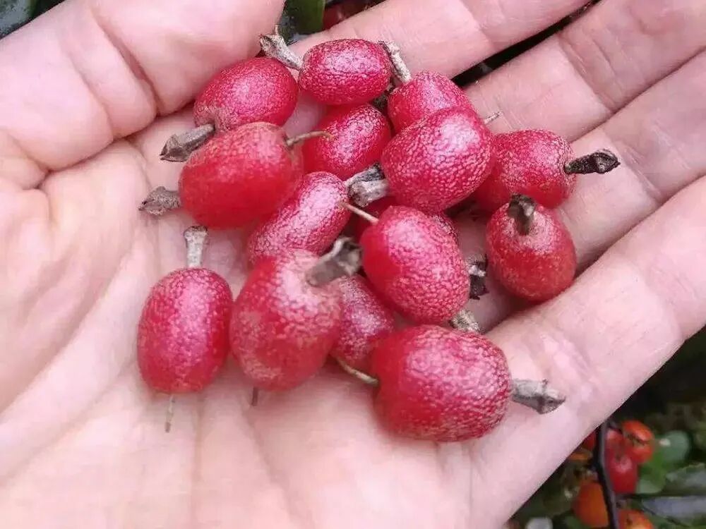 在所有野果当中,刺泡算得上是结果实最早的一批了,一般在3月中下旬就会结果实,等到4月份就会成熟(注:北方地区可能稍晚点,要到5月份了),其果实成熟以后是红色的,看起来酷似草莓。至于味道的话,在笔者个人看来还是很不错的,酸甜可口,汁水也很丰富。