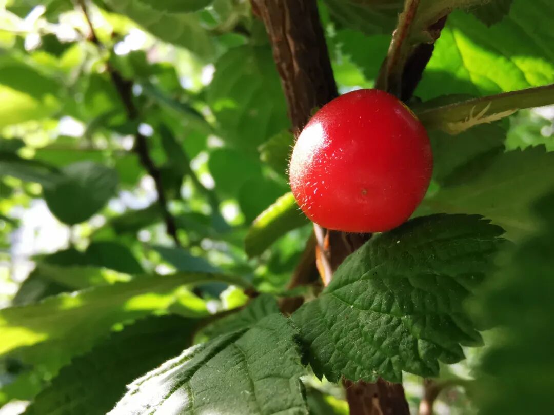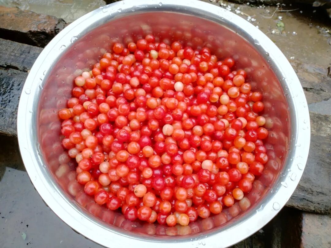 毛樱桃的个头不大,比市面上人工种植的小樱桃还小那么一丢丢。味道的话则是味酸甜,可直接食用,也可以用来酿酒、做樱桃果酱。
