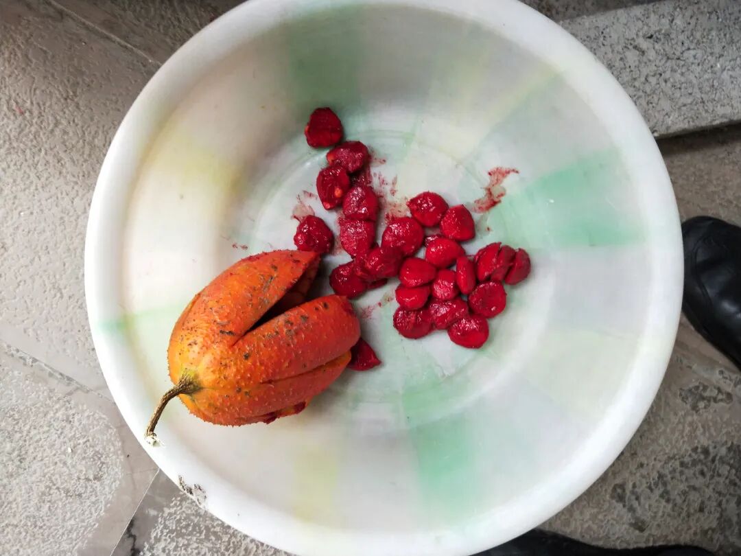 至于木鳖的果实木鳖子,则是另一个风味了。它主要食用的是里面的种子,也就是里面那红色犹如钱币一样的种子,吃起来的味道甘中带有一丝丝苦味。