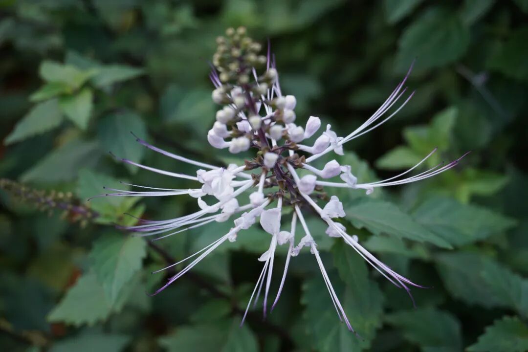 肾茶最有特点的,就是其花期时所开的花,它的花为轮伞花序,花序很长,一般能有12厘米左右,大概有5到6层的样子,每层都会开出4到6朵白色小花,同时每朵花还会长出长长的花丝,这些花丝看起来和猫的胡须极为相似。故而在民间,肾茶也多被称作“猫须草”。