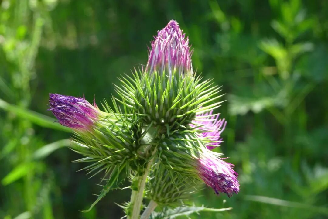 这时候的大蓟首先会在茎秆上长出细长且坚硬的小刺,接着会在叶子边缘长满刺,等到花期时,它的花托就是个妥妥的“刺球”,虽然看着美丽,却让人不敢靠近,更别说采摘了,生怕一不小心没站稳,就会被它的刺扎伤了手。