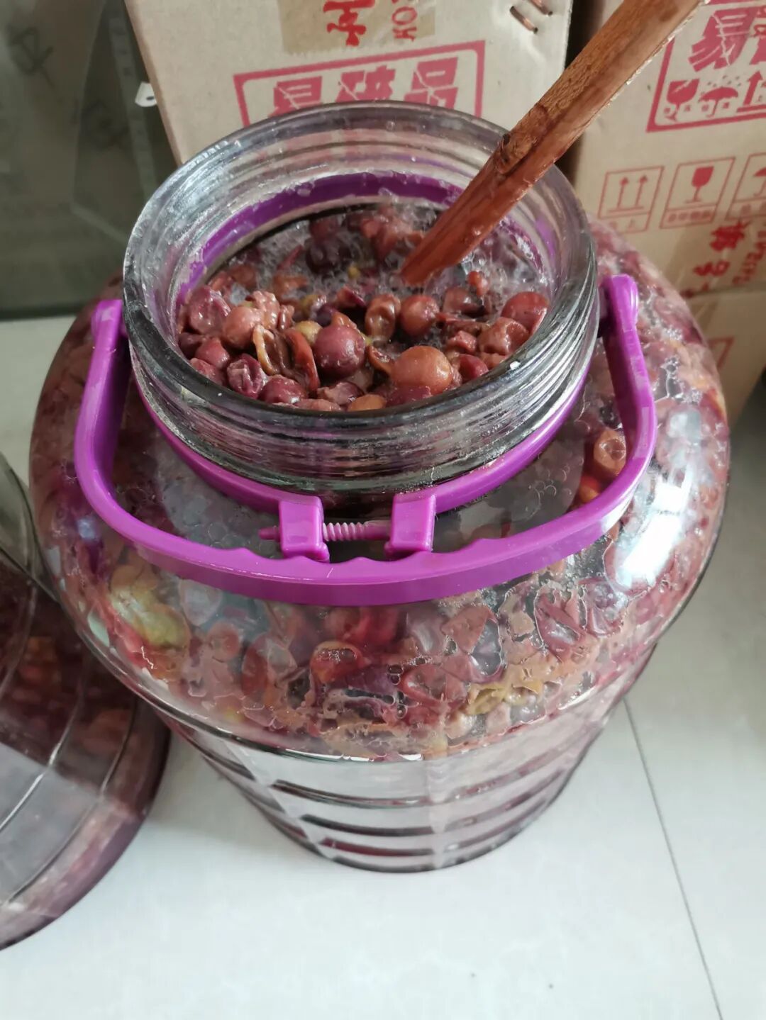 2、装瓶。本来这是放缸里的,但咱们用的山葡萄不多,就装瓶,不过是比较大的那种瓶子。将所有处理好的山葡萄放到瓶中,放入老冰糖块,这里建议按10:7的比例来放,即10斤山葡萄7斤老冰糖。然后抽出瓶中多余空气,再将瓶子封严实,放到阴凉处。