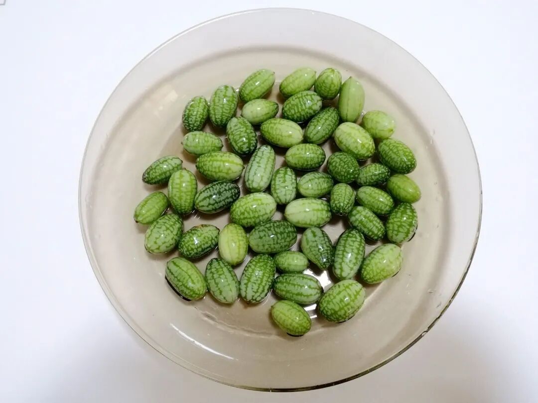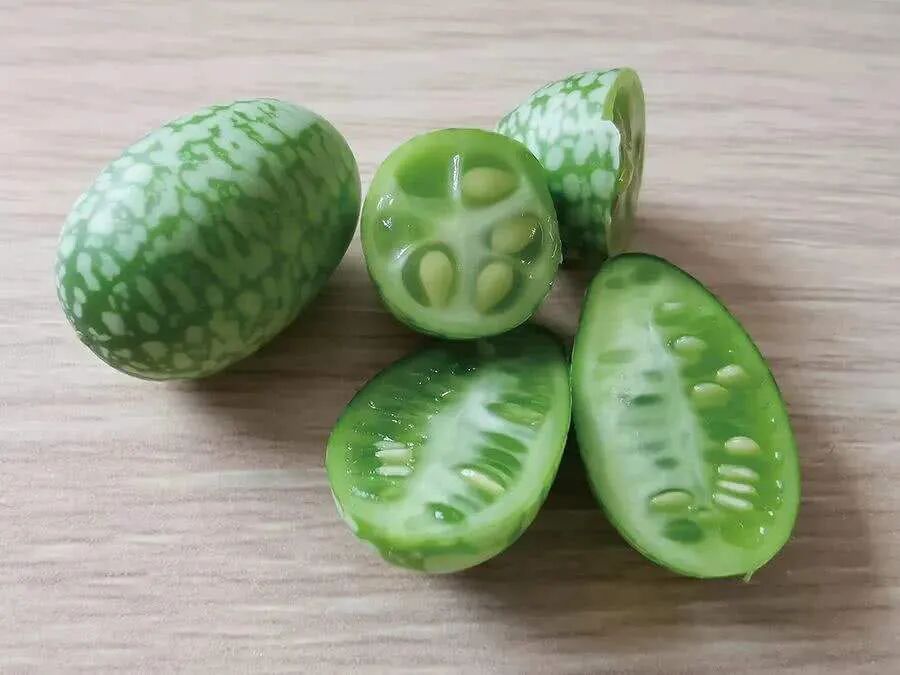 除此之外,它的口感也和西瓜不一样,西瓜内瓤是红的,味道是清甜的,而拇指西瓜内瓤是青绿色,味道则是综合黄瓜和柠檬,也就是既有黄瓜的清香,又有柠檬的酸甜,有点类似酸黄瓜。