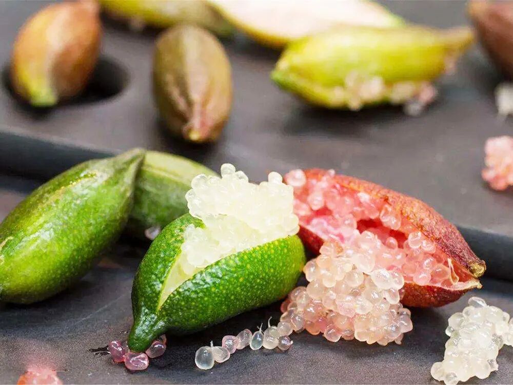 而手指柠檬果肉的颜色也和果皮颜色一样,有很多种,并且其果肉是犹如鱼子般大小的微粒,一粒粒闪耀着晶莹的光泽,乍看好似鱼子酱,在观感上就很不错。