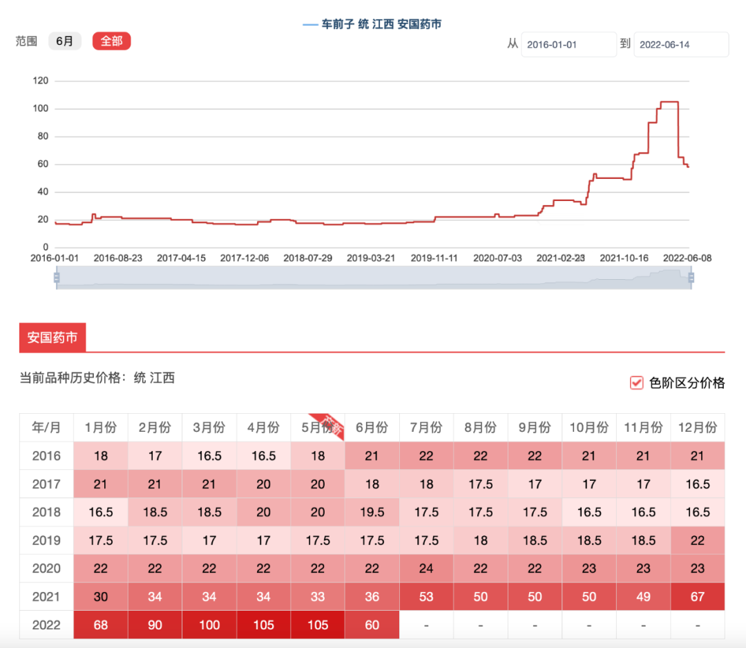 跟往期的上涨不一样,这一次价格是直线上涨,几乎就没有跌过,到了2021年,一下子就从之前的20多元一公斤涨到了50多元一公斤。而在2022年春节过后,车前子整体还出现了供不应求的情况,再加上其他因素的跌价,让车前子的行情直接起飞,突破了百元大关。