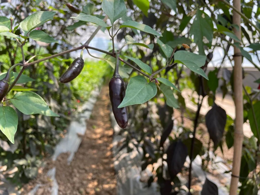在天蔬农场也有很好的例子,比如辣椒,笔者观察到有黑色、紫色的辣椒,个头不大,类似于七彩椒的大小,味道甜辣,十分适合用来给菜配色、增味。