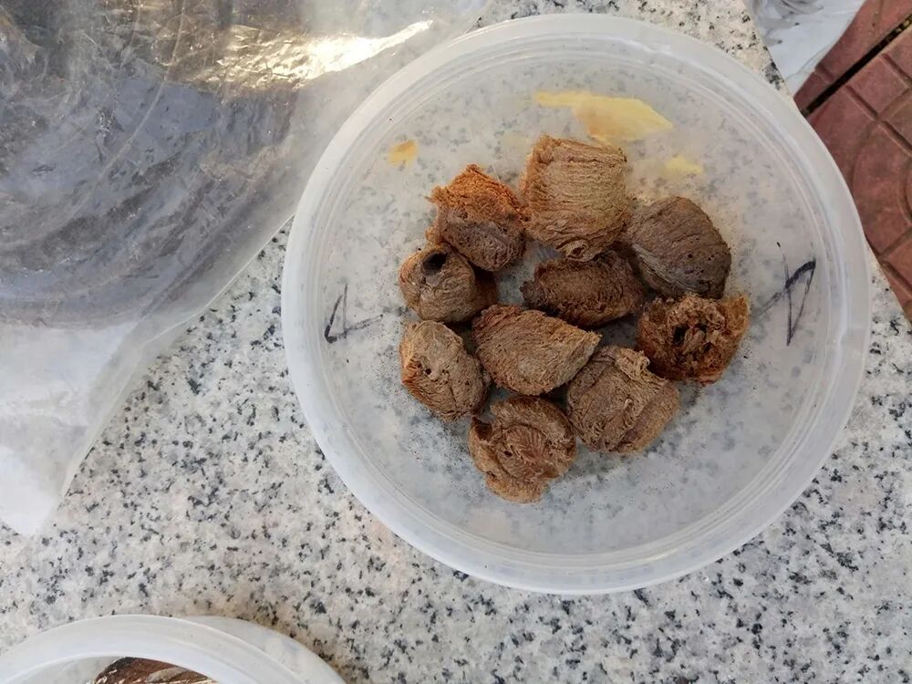 然后呢,要是哪家的小娃娃尿床比较严重的话,家里的老人家就会去野外的桑树上寻找这种虫卵,也不需要找太多,一般找个4、5就行,然后就用根竹签把这4、5个虫卵串起来,放到灶上用火烤一烤,烤好了就给娃们吃。